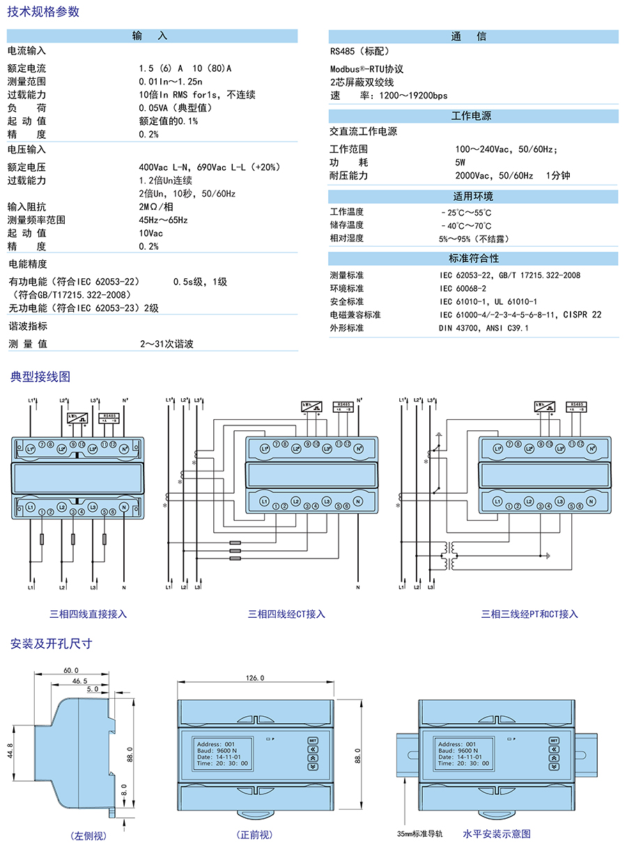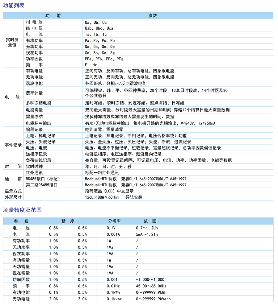 符合DL/T645-2007多功能電能表通訊協(xié)議,80A以下直接輸入無需外接互感器。復費率、諧波測量、需量、凍結等功能。